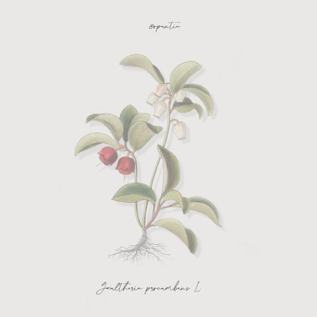 Piccolo arbusto sempreverde, appartenente alla famiglia delle Ericacee. A portamento prostrato, la pianta può raggiungere i 20 cm d’altezza per altrettanta larghezza. Gaultheria procumbens presenta foglie ellittico-ovate, lunghe fino a 2-5 cm e larghe 1-2 cm.