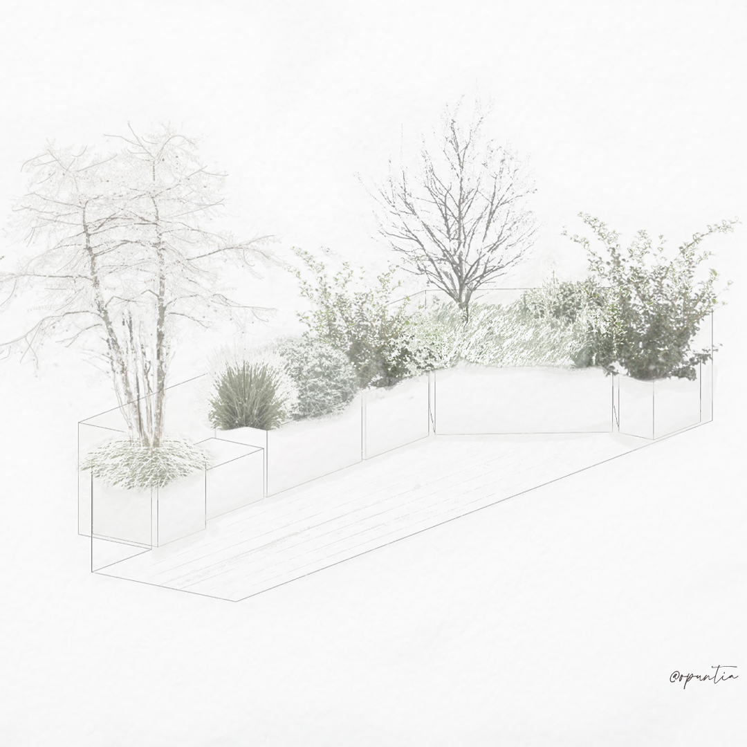 Casa I. presenta un piccolo terrazzino sagomato che si affaccia ad ovest proprio dinnanzi ad una palazzina che viola in maniera assai importante la privacy di questo spazio. A tal proposito quindi, abbiamo pensato di costruire un sistema di fioriere sagomato su misura, composta da moduli ad incastro aventi altezza di 60 cm, in cui abbiamo piantumato arbusti, piante erbacee e graminacee per lo più sempreverdi, ricreando un effetto foresta capace tra le altre cose di conferire ombra alla facciata. In questo sistema di fioriere, abbiamo pensato poi, di posizionare anche due alberetti albero, così da rendere interessante il volume… abbiamo infine posizionato, sotto ad uno degli alberelli presenti, una cassa- panca in alluminio, coordinata alle fioriere con coperchio apribile, così da permettere al cliente di riporvi al suo interno coperte e dei cuscini da esterno per vivere al meglio il terrazzo, in tutte le sue stagioni!