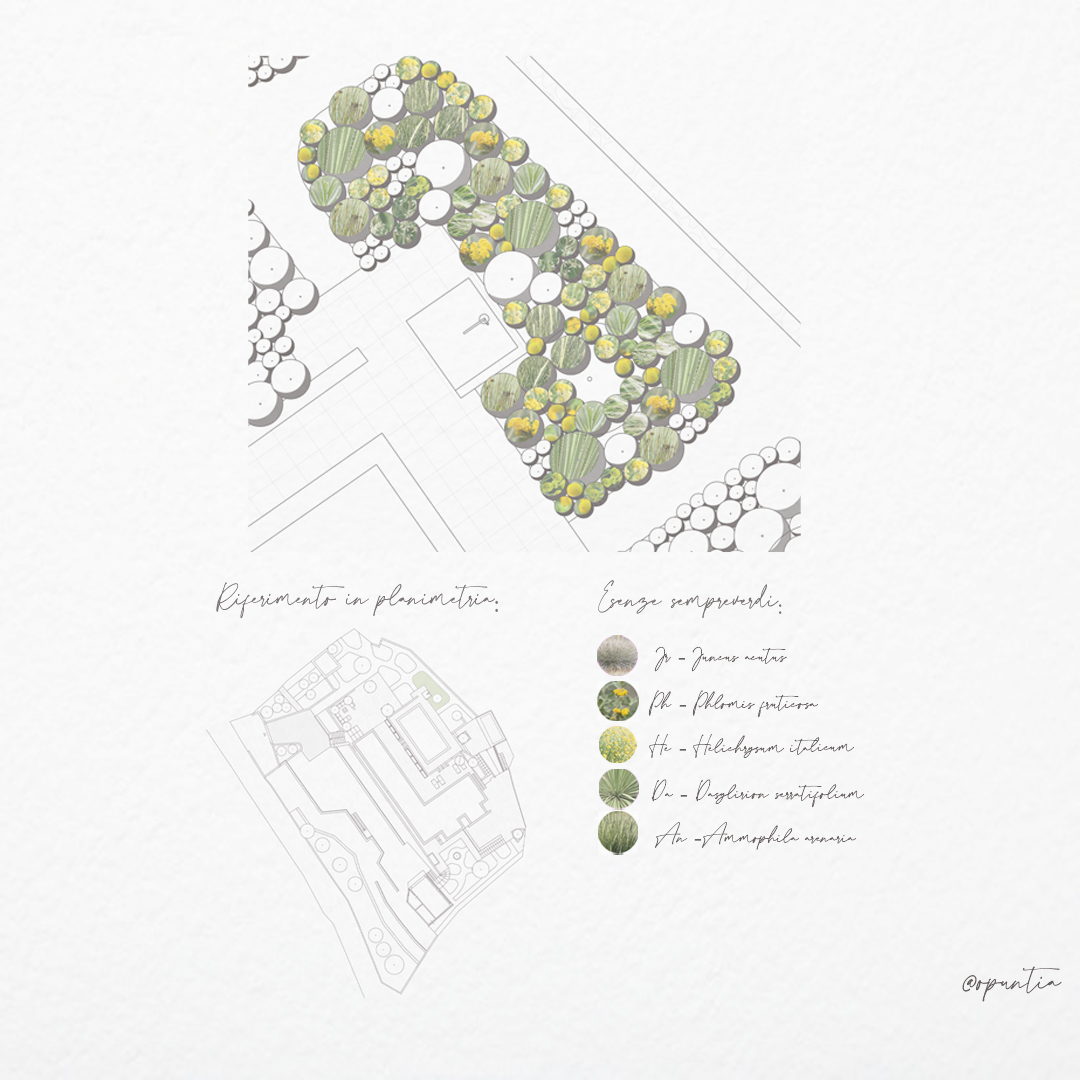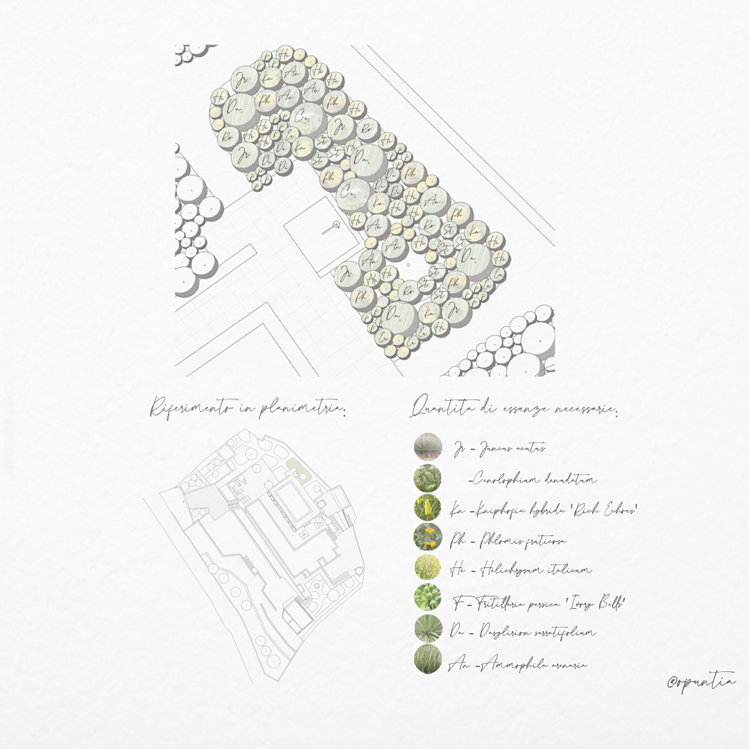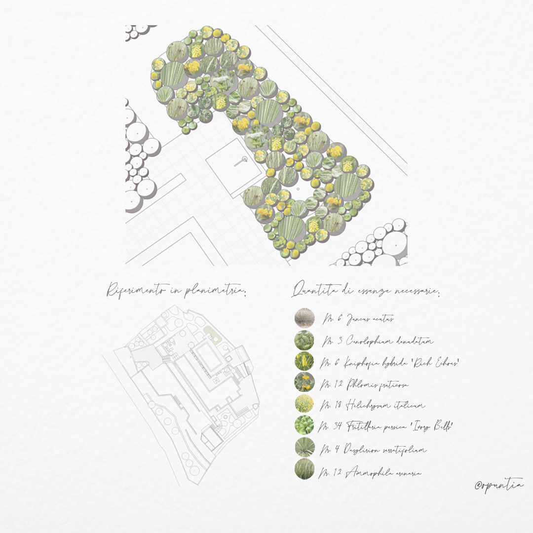 Lo studio del sesto d’impianto e delle dimensioni a maturità delle essenze ha guidato la composizione, permettendo di instaurare relazioni armoniche tra le piante, bilanciate per peso visivo, ritmo e direzione. La successione delle fioriture garantisce continuità cromatica dalla primavera all’autunno, mentre la presenza di sempreverdi assicura struttura e qualità spaziale anche nella stagione invernale.