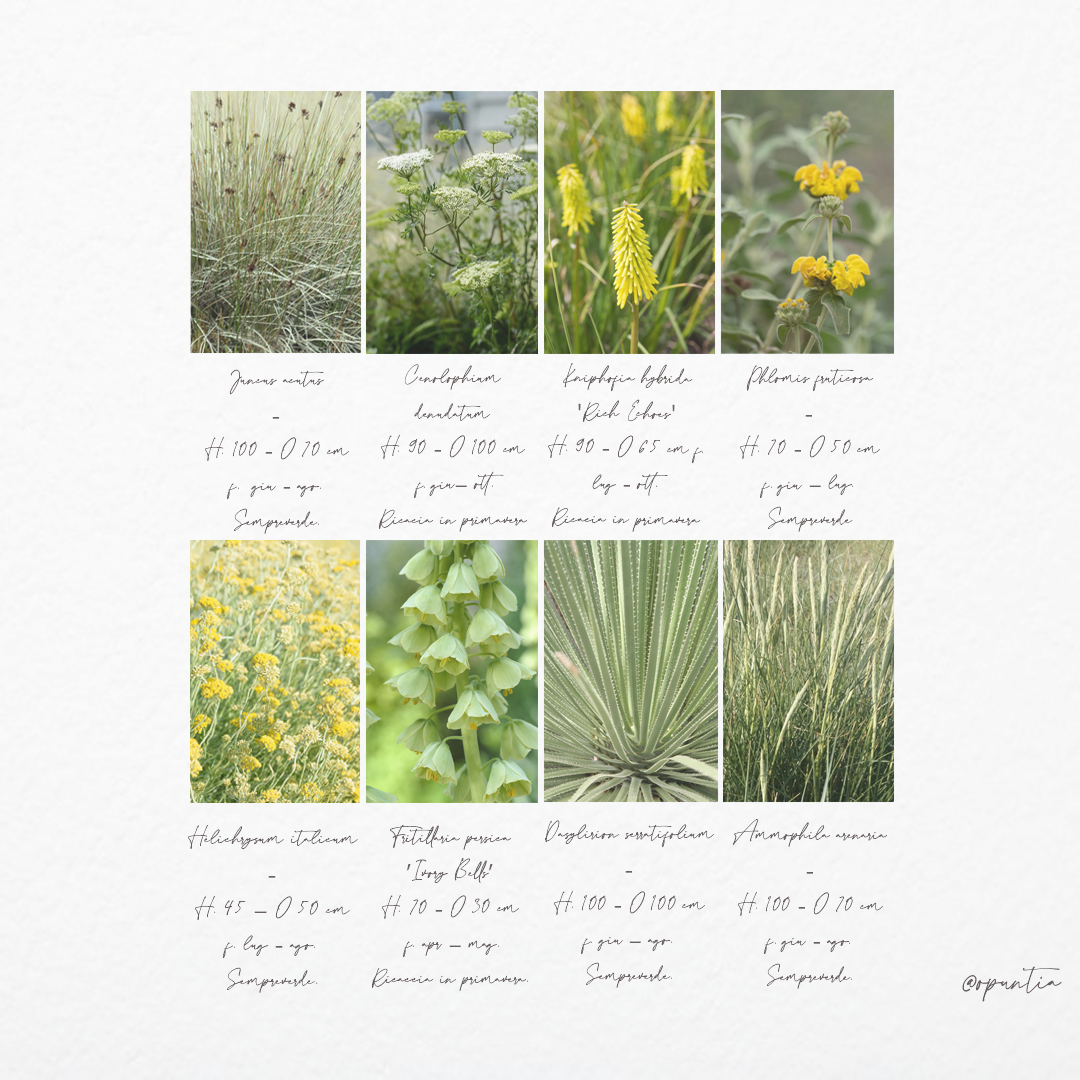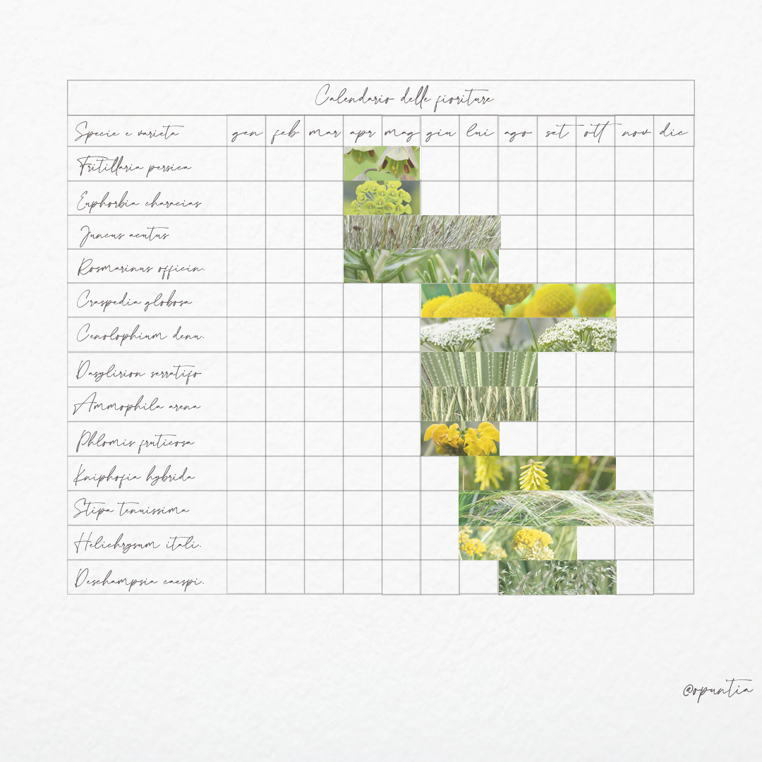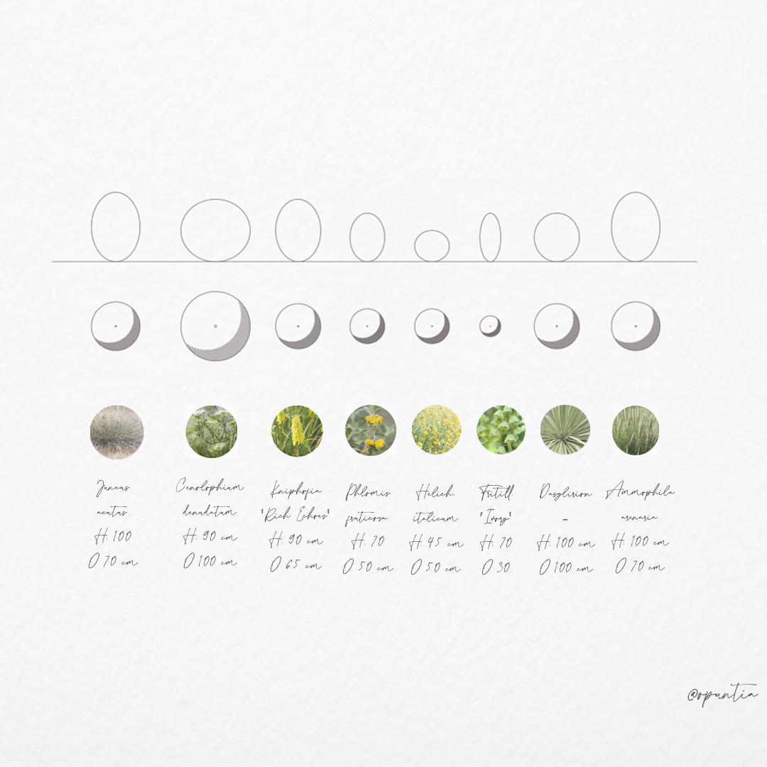 Lo studio del sesto d’impianto e delle dimensioni a maturità delle essenze ha guidato la composizione, permettendo di instaurare relazioni armoniche tra le piante, bilanciate per peso visivo, ritmo e direzione. La successione delle fioriture garantisce continuità cromatica dalla primavera all’autunno, mentre la presenza di sempreverdi assicura struttura e qualità spaziale anche nella stagione invernale.